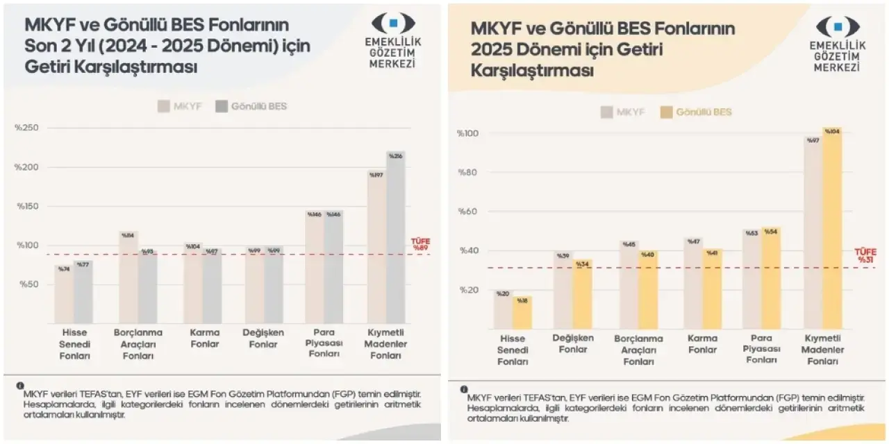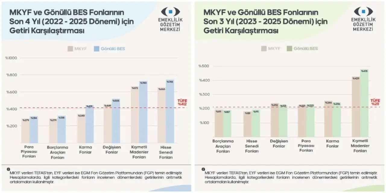 EGM’nin 2024–2025 ve 2023–2025 dönemlerini kapsayan karşılaştırmaları, zaman uzadıkça BES fonları ile yatırım fonları arasındaki makasın açıldığını gösteriyor.